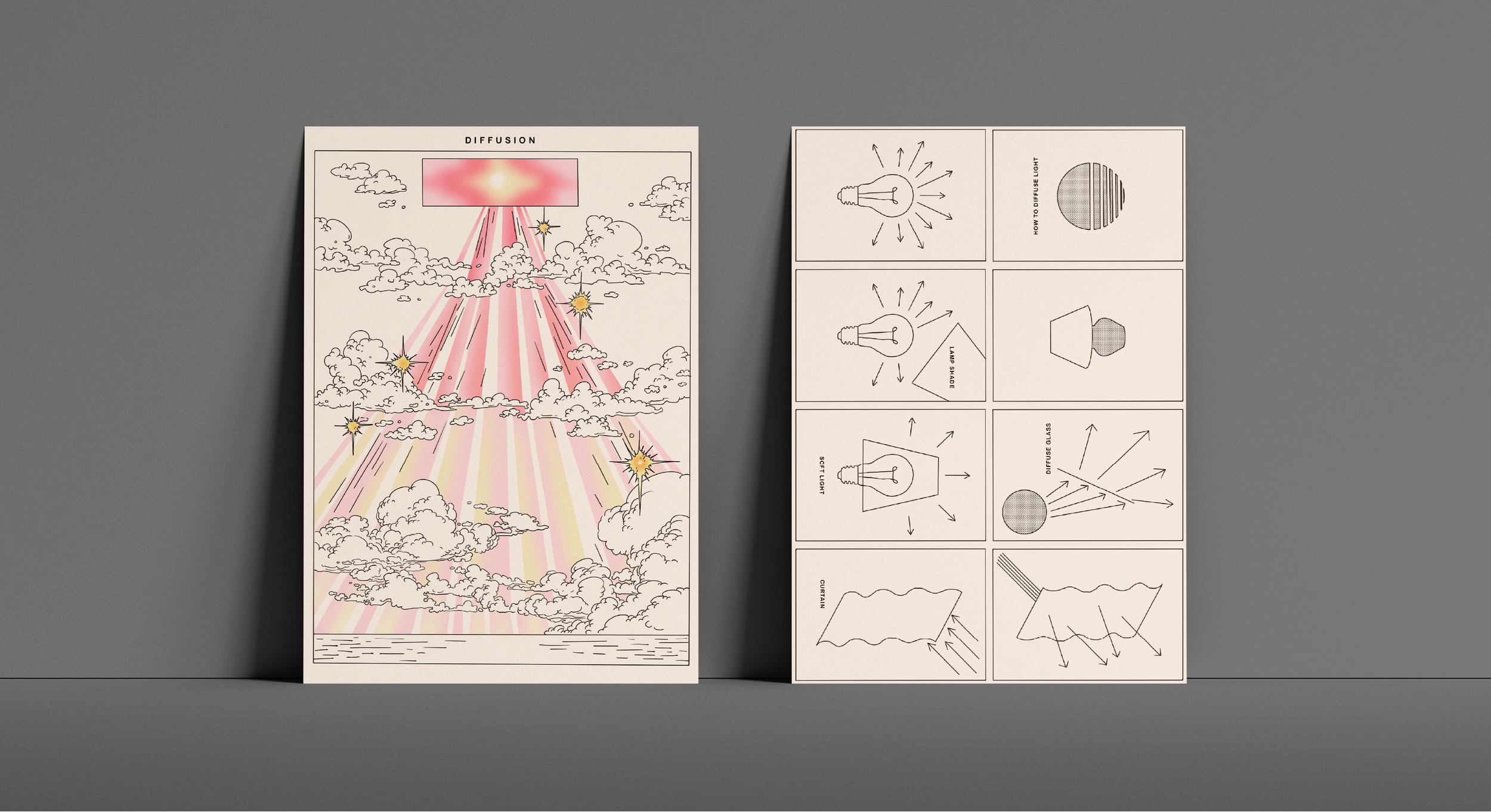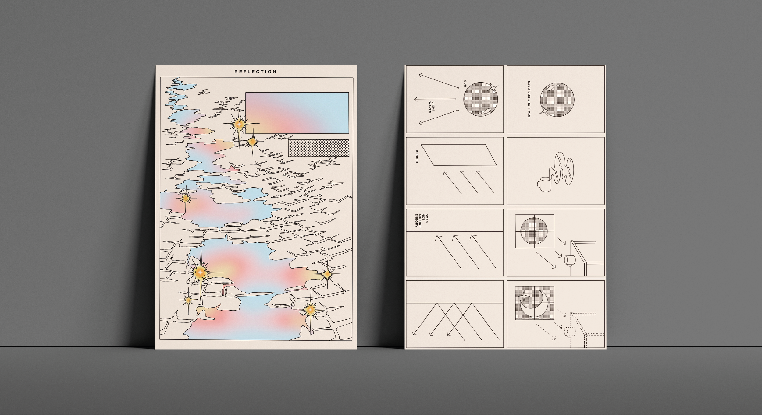 Educational poster-zines designed to visually educate the three properties of light: reflection, refraction, and diffusion. Each poster unfolds into informational zines.